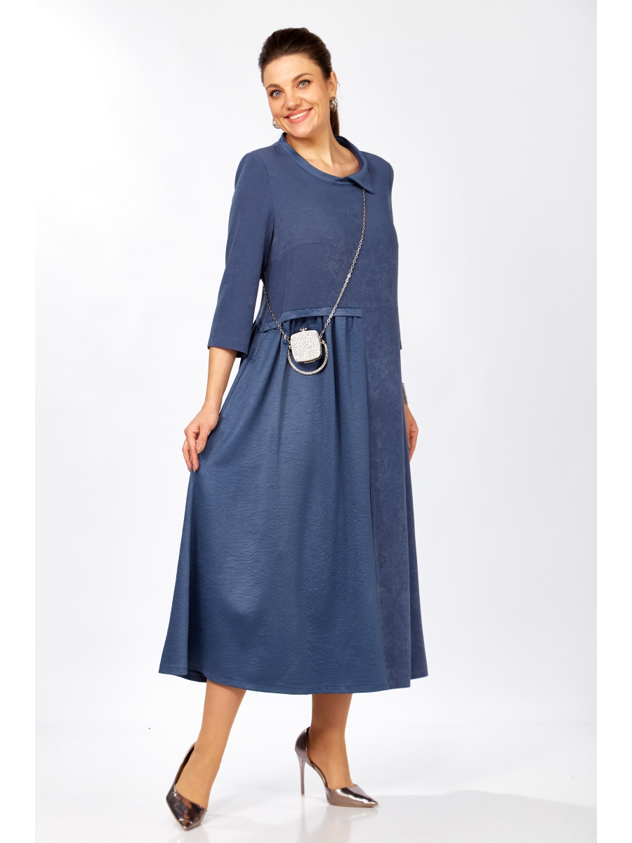 Нарядное платье полуприлегающего силуэта в изысканном дымчато-голубом оттенке, отрезное по линии талии с обтачными планками. Полочки с нагрудными вытачками, которые выходят из бокового шва. Нижняя часть платья А-силуэта с одной стороны по линии талии с образованием мягких складок. Особенно выигрышно оно смотрится на фигуре, где надо прикрыть живот и бедра. Рукав втачной одношовный, длиной ¾. Вырез горловины округлой формы со стойкой и фантазийным воротником. Пошито платье из двух видов плательной ткани-бархатистой и шелковистой структуры.