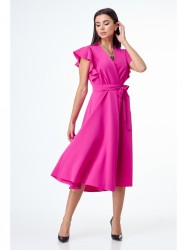 Элегантное соблазнительное платье из плотной непрозрачной ткани, отрезное по талии. Застегивается на две потайные кнопки с глубоким запахом. По спинке средний шов. Плечо прикрывает волан. Юбка «полусолнце» распахивается по переду. Пояс съемный длинный.