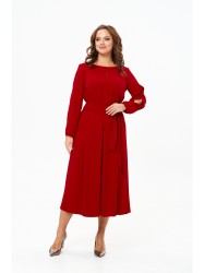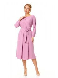 Элегантное женственное платье длины midi из струящейся нарядной ткани. Платье отрезное по талии, застежка по горловине спинки. Лиф с нагрудными вытачками и декоративным разрезом «капелька». Юбка со складками. Рукав втачной длинный, c разрезами «капелька» по центру. Низ собран на эластичную тесьму. Пояс съемный длинный. Платье без подкладки.