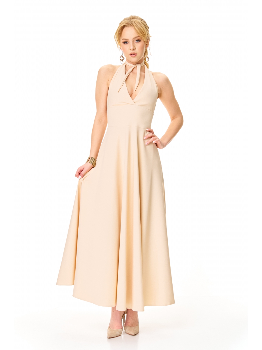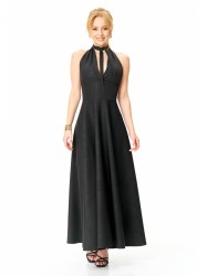 Платье из плотной ткани с блеском, длина "в пол», верх открыт. Юбка клеш, высокий пояс-корсет для тонкой талии. Грудь закрыта полотном, переходящим в завязки по шейке. Застежка молния по талии.