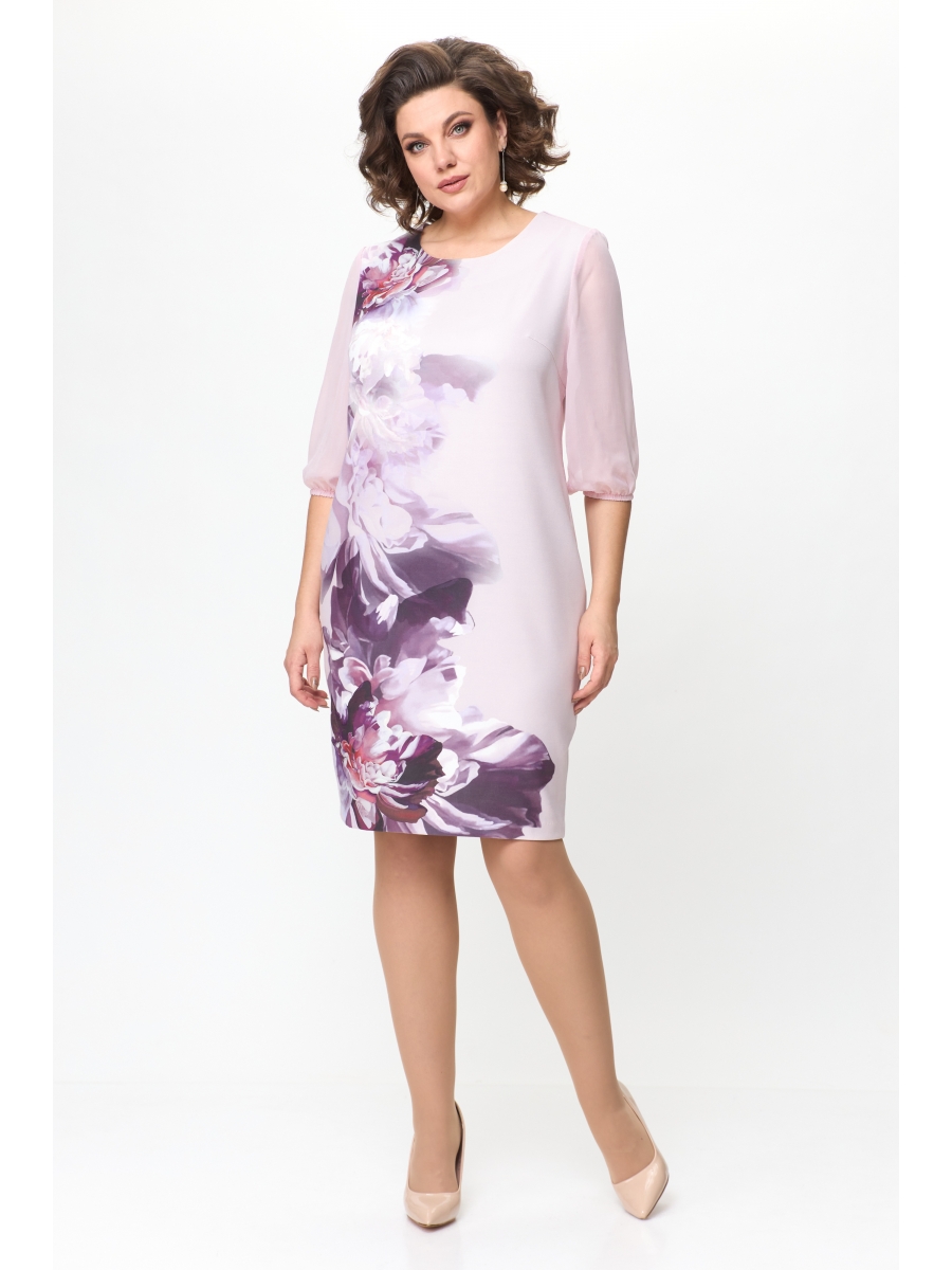 Женское, нарядное платье приталенного силуэта. По переду нагрудные вытачки. Спинка со средним швом, переходящим в шлицу и талевыми вытачками. Горловина-округлая. Рукав втачной 3/4 из шифоновой ткани заканчивающися резинкой. Ткань немного тянется.