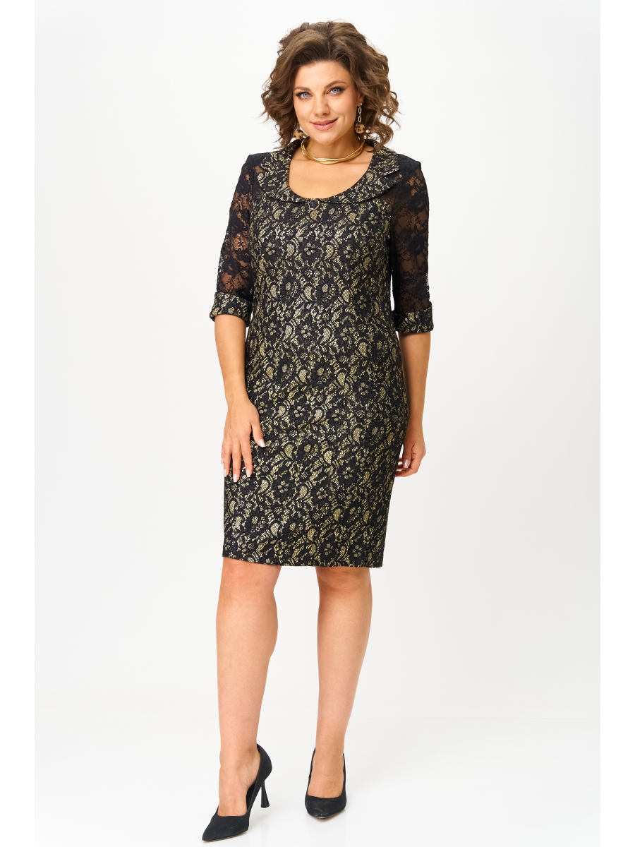 Нарядное платье приталенного силуэта, выполнено из комбинации двух тканей: вверх платья выполнен из гипюра черного цвета, что придает платью нарядность, воротник фигурный из основной ткани, низ из комфортного плотного трикотажного гипюра с люрексовой нитью золотистого цвета. По переду платья фигурные рельефы. Спинка со средним швом и таллиевыми вытачками. Рукав втачной из черной кружевной ткани, 3/4.