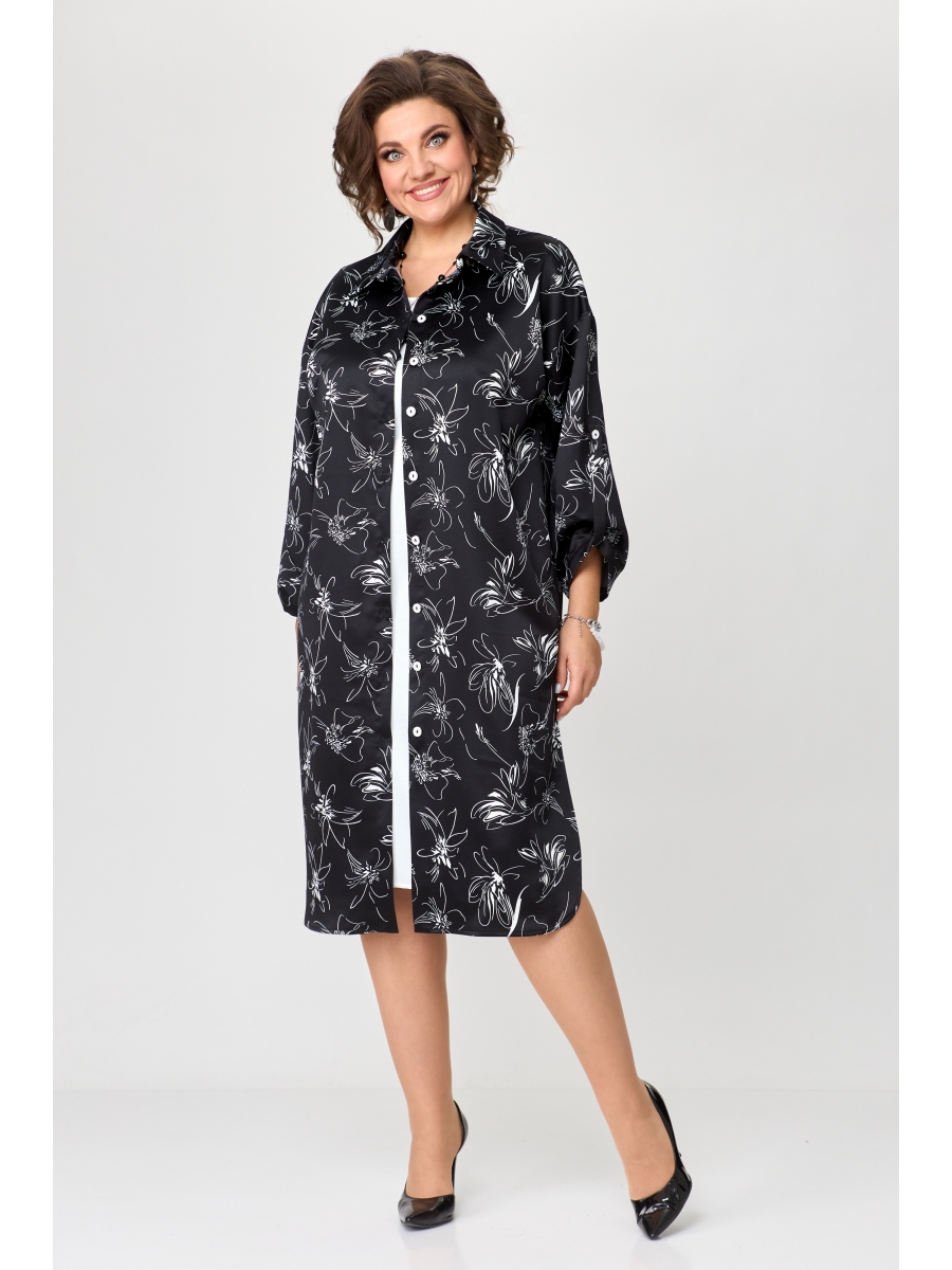 Платье состоит из удлинённой рубашки с отложным воротником. По передней части планка, застежка-пуговицы. Свободный крой, по бокам фигурные подрезы. Вторая деталь этого наряда - имитация платья. То есть передняя часть платья однотонного черного цвета вшита по боковым швам в саму рубашку и создается впечатление, что наряд двухпредметный. В расстёгнутом виде смотрится как платье и поверх надета рубашка. Однотонная часть платья выполнена из мягкой и приятной ткани. Ткань цветная на вид как плотный атлас.