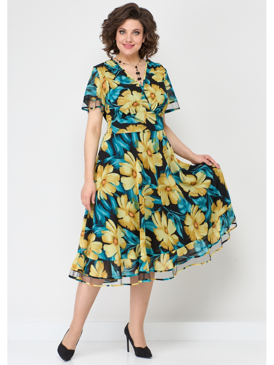 Нарядное женское платье из шифоновой ткани. Отрезное по линии талии. По полочке, по линии идет фигурная кокета переходящая в пояс, которая регулирует ширину талии и завязывается сзади. Низ изделия юбки полу солнце-клеш. По низу юбки пришит волан, состоящий из шифоновой ткани с фатином. Волан обработан бейкой в цвет изделия. Платье на хлопковой подкладке. Рукав короткий, по низу которого также пришит волан, состоящий из шифоновой ткани и фатина. Вырез горловины треугольный, глубину выреза можно регулировать пришивной кнопкой. По центру спинки потайная молния.