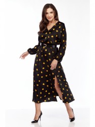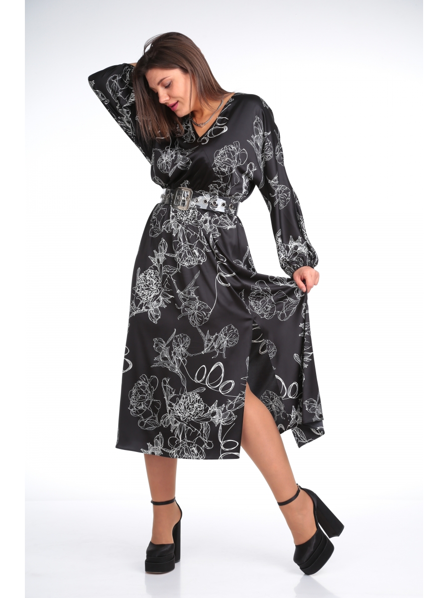 Платье женское из атласного сатина с V-образным вырезом горловины. Покрой рукава цельнокроеный с лифом. Низ рукава собран на резиночку. Боковой шов переходит на перед, заканчивается разрезом. Платье без подкладки.