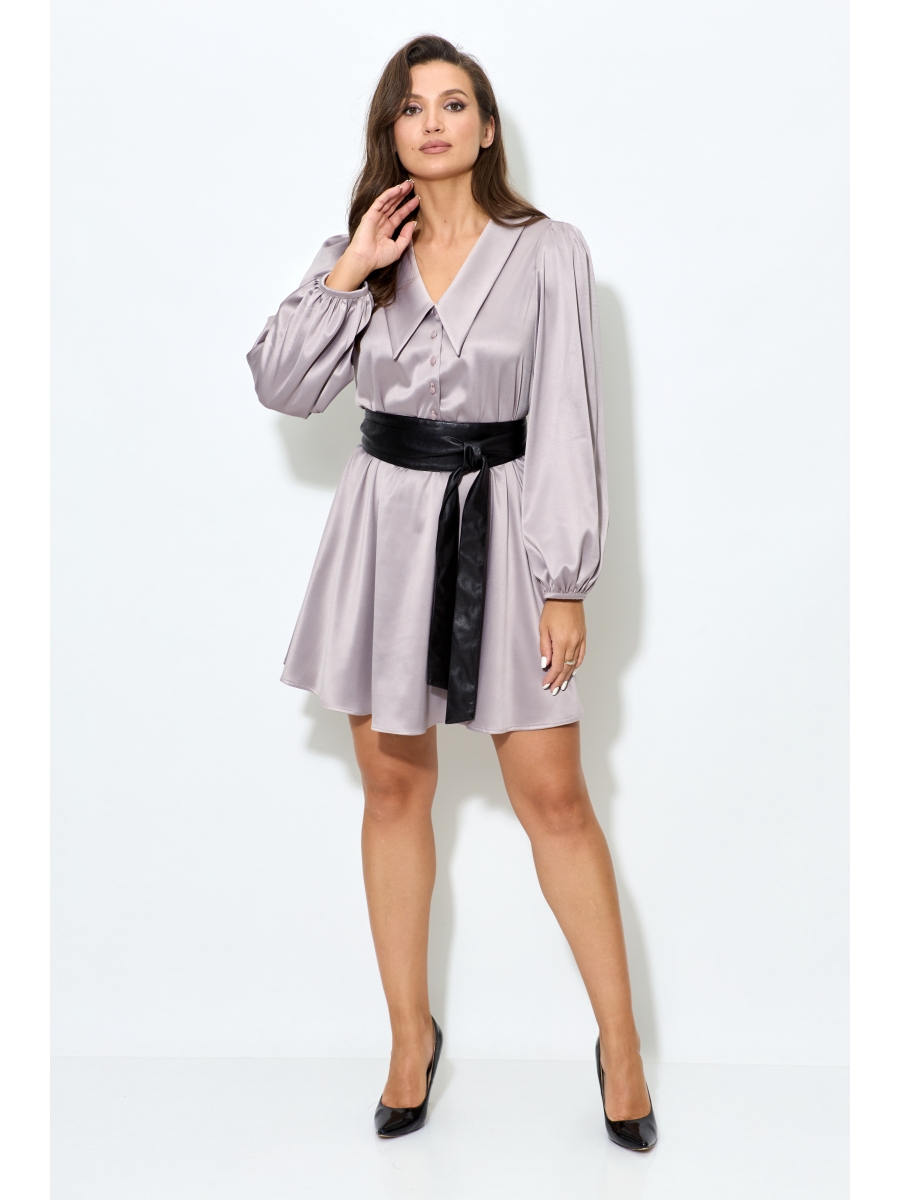 Платье женское, выполненное из первоклассного атласа в Х образном силуэте, без подкладки. Отрезное по линии талии и имеет длину выше колена. Воротник втачной, плосколежащий с удлиненными концами, а рукав втачной, одношевный и расширенный с присобранным и окантованным низом.