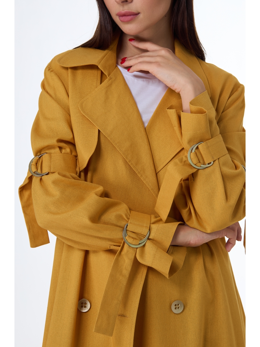 Прямой свободный силуэт со всеми деталями классическоготренча: отлетные кокетки по переду и спинки, с карманами, патами на свободных втачных рукавах, отложным воротником на стойке и лацканами, двубортной застёжкой на пуговицы и завязывающимся поясом.