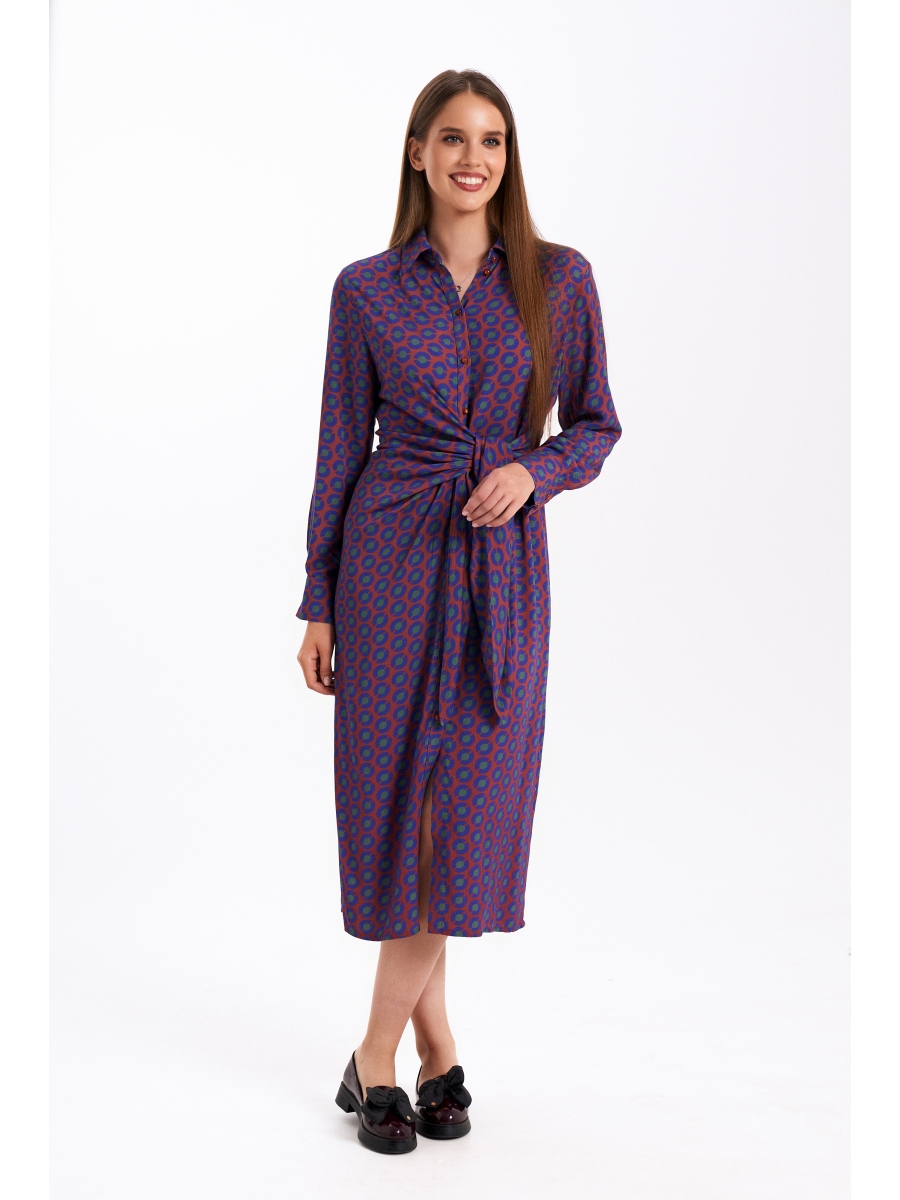Платье женское прямого силуэта, умеренного объема. Перед ассиметричен. На правой части переда на уровне талии оформлен цельнокроеный пояс. На левой части переда на уровне талии расположена притачная деталь пояса. Спинка разрезная по линии талии, а также имеет 4 талиевые вытачки. Линия плеча чуть спущена. Рукав втачной, длинный. По нижнему срезу рукава притачная манжета с застежкой на петлю и пуговицу. Воротник стояче-отложной рубашечный. Платье длиной ниже линии колена с застежкой на петли и пуговицы.