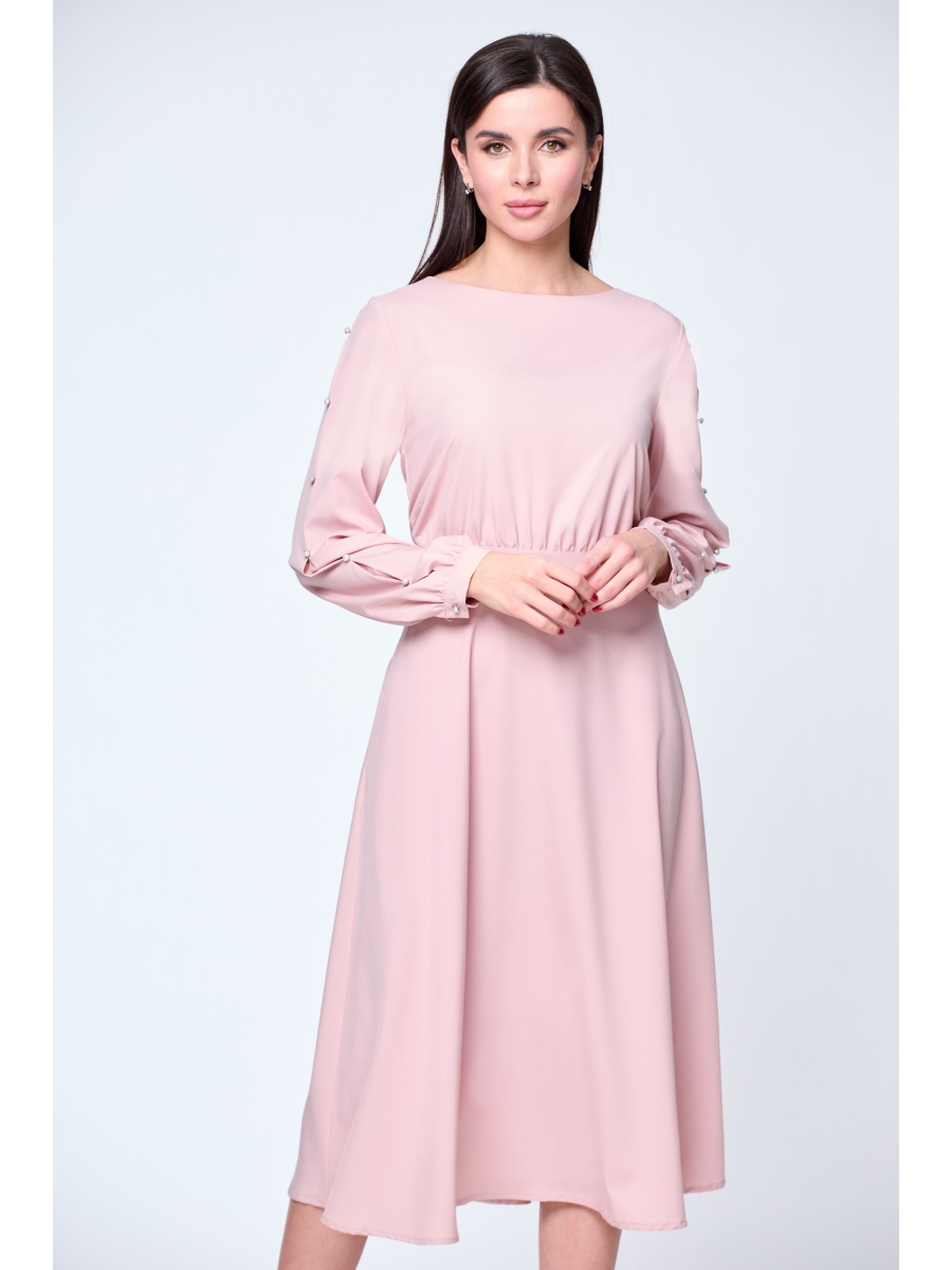 Романтичное платье нежного оттенка подойдёт для любых типов фигуры. Отрезная линия талии, потайная молния по спинке, длинный рукав сосборен на манжетах. Милые разрезы на рукавах украшены пуговкой -жемчужинкой.
