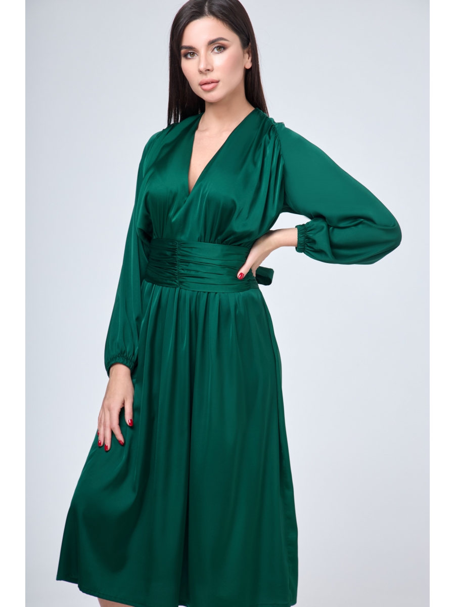 Платье зауженное по талии, длина до середины голени, V- образный вырез по переду, потайная застежка молния в боковом шве. Рукав длинный расширенный к низу на резинке. Сборка по груди и талии придаёт образу кокетства, игривости и свободы, а притачной пояс сохраняет изгиб вашей талии. Съёмный пояс поможет вам корректировать силуэт фигуры.