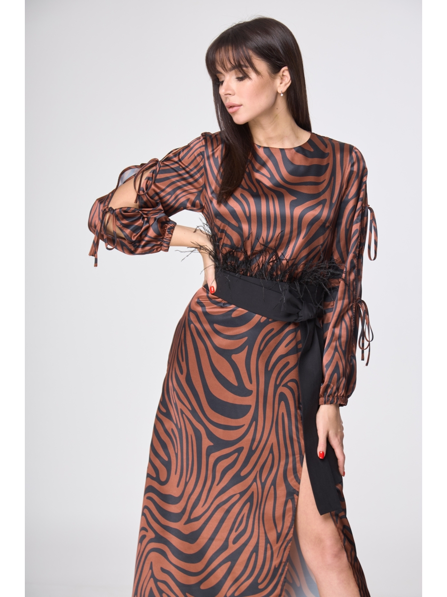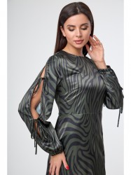 Платье прямого силуэта, отрезное по талии, длинное. По центральному шву спинки потайная застежка молния. По переду разрез, который придаст образу игривости и даст вам свободу для передвижения. Рукав длинный, на резинке по низу. По всей длине рукава разрез, который декорируется лентами. Горловина округлая.