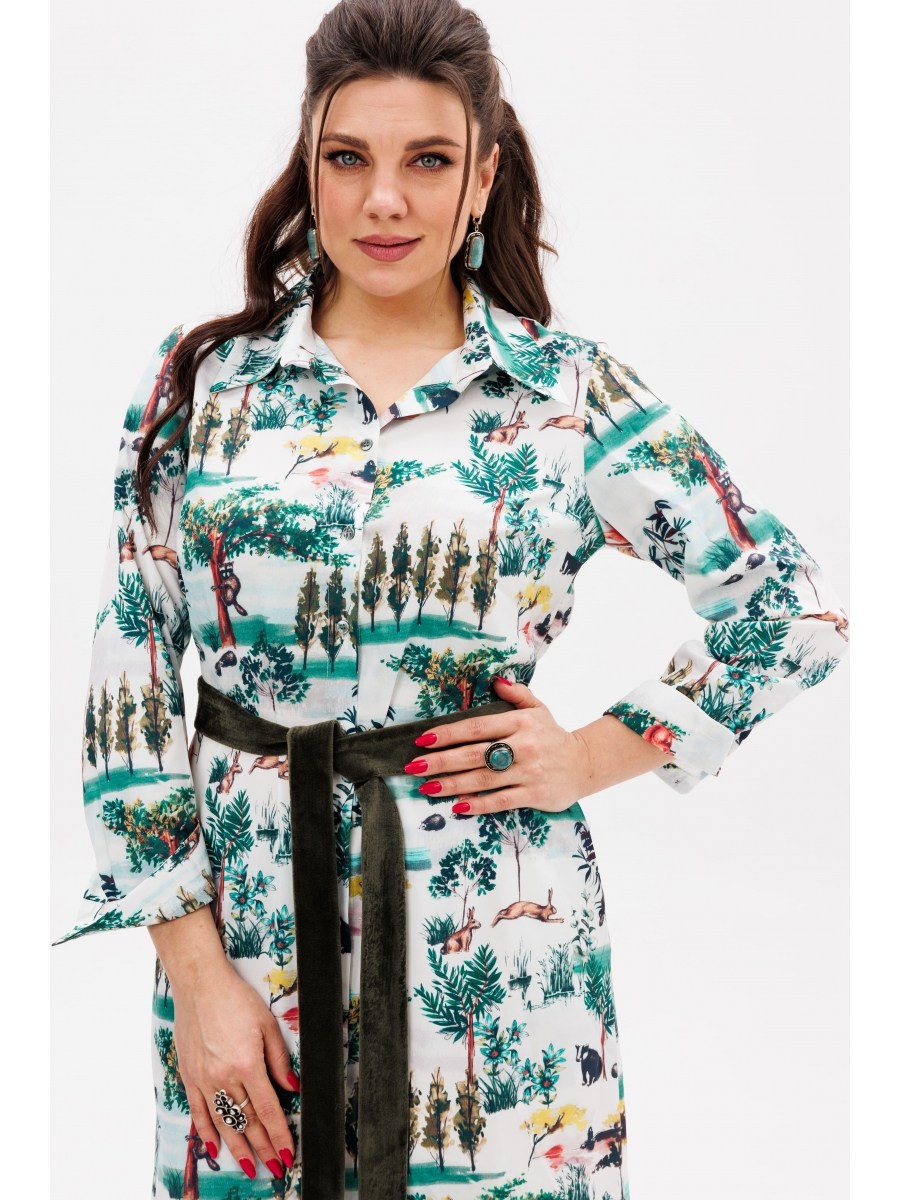 Особый шарм платью придаёт съёмный пояс с кисточками, подчёркивающий талию и добавляющий нотку игривости. А принт «лесное царство» оживляет образ, наполняя его природной теплотой и романтикой.