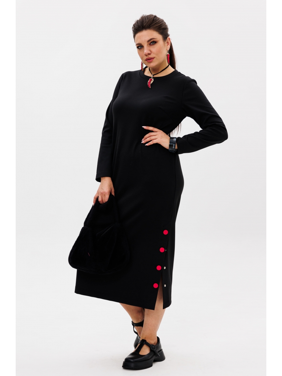 Особенность модели — стильная шлица на кнопках, расположенная сбоку, которая не только добавляет оригинальности, но и позволяет варьировать образ: расстегнув несколько кнопок, можно создать лёгкий, игривый акцент. В боковых швах предусмотрены карманы, что делает платье ещё более практичным и удобным.