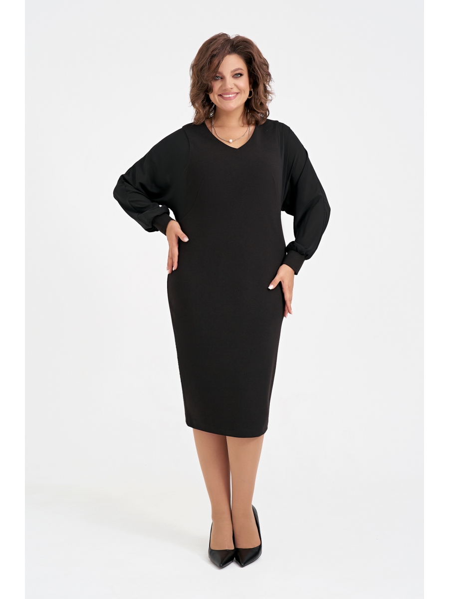 Женское платье полуприлегающего силуэта выполнено из двух видов ткани. Перед и спинка - из плательного трикотажа, рукава - из креп-шифона. Рукава выполнены с углубленной линией проймы и манжетами.