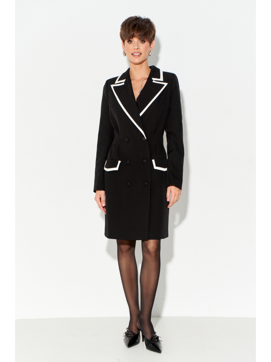Двубортное классическое женское платье-жакет полуприлегающего силуэта на подкладке выполнено из плательной ткани с содержанием вискозы. По переду изделия не функциональные накладные карманы; по линии талии складки; рукава втачные; воротник пиджачного типа; по лацкану и карманам платья контрастная отделка молочного цвета. Платье полностью соответствует заявленному размеру. Контрастные ткани устойчивы к перекрашиванию благодаря современным технологиям, что предотвращает смешивание красок, сохраняя цвета ткани даже при совместной стирке.