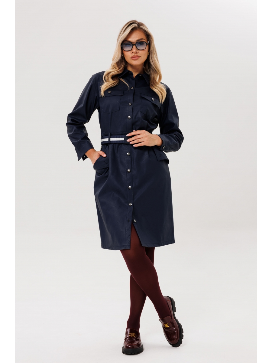 Элегантное платье из эко кожи полуприлегающего силуэта. Модель средней длины с центральной застежкой на пуговицы создает собранный и стильный образ.