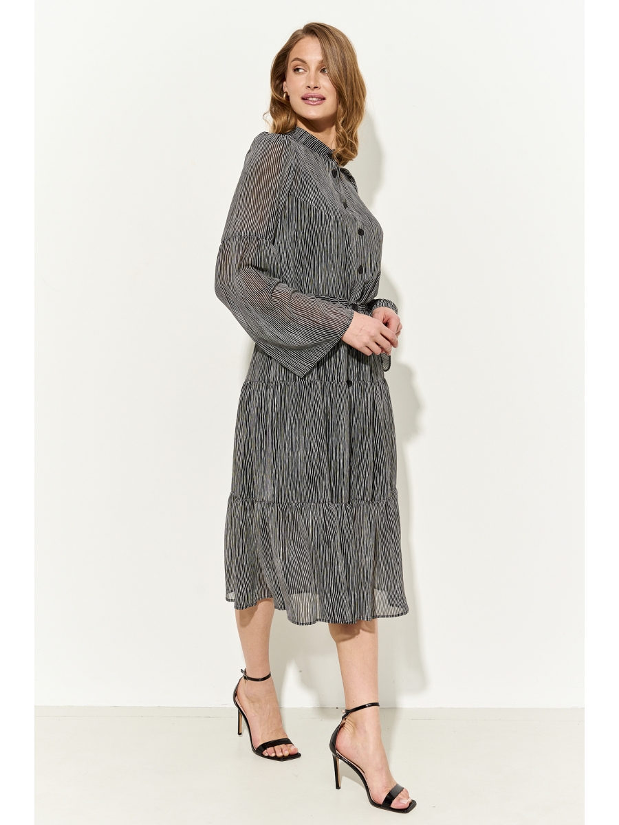 Платье женское полуприлегающего силуэта из шифона на подкладке. Перед платья с нагрудными вытачками; по линии талии вставлена резинка; юбка изделия украшена тремя воланами с небольшой сборкой; рукава втачные с аккуратной сборкой по окату и по отрезной части рукава. Верхняя часть платья имеет подкладку в виде топа на регулируемых бретелях, что обеспечивает комфортную посадку; нижняя часть подкладки - отлетная. Застежка-планка на петли и пуговицы.
