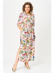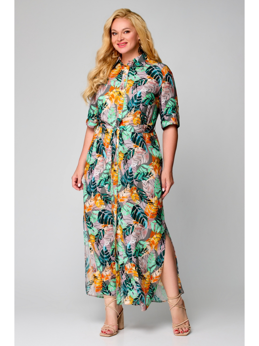 Платье рубашка прямого силуэта длиной макси. Линия плеча слегка спущена. Воротник отложной на стойке. По переду притачная планка с застежкой на 10 петель и пуговиц. По линии груди вытачки. В боковых швах карманы. По линии талии пояс в тон ткани. По верхней части спинки притачная кокетка, нижняя часть со встречной складкой. Рукав втачной, короткий понизу манжета с патой на пуговицу.