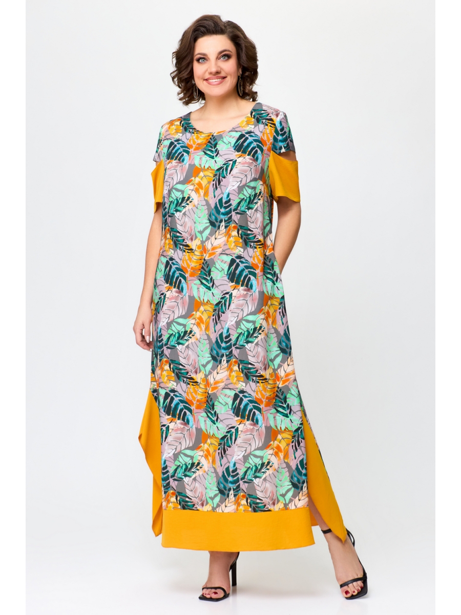 Платье женское полуприлегающего силуэта расширенное книзу, длиной макси, с коротким рукавом. По линии груди вытачки. Спинка со средним швом. Низ платья фигурный. В боковых швах обработаны карманы. По низу платья и рукавов вставка из отделочной ткани.