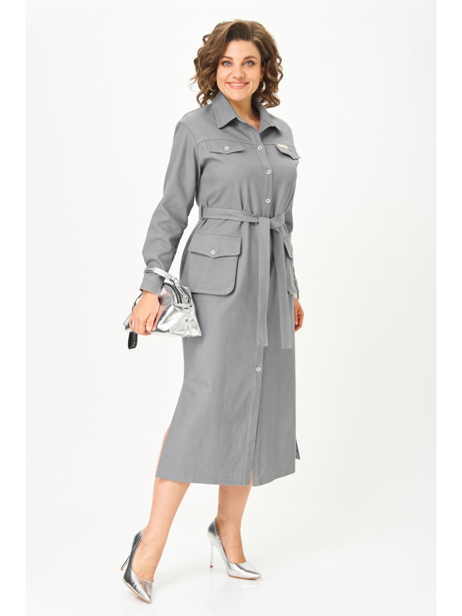 По переду центральная планка с застежкой на петли и пуговицы. По горловине отложной воротник на стойке. По переду в верхней части кокетка и декоративные клапаны в нижней части выполнены объемные накладные карманы с клапаном. По спинке кокетка, и складка из-под кокетки. Рукав втачной со спущенной линией плеча, но низу с притачной манжетой. По талии платье фиксируется съемным поясом.