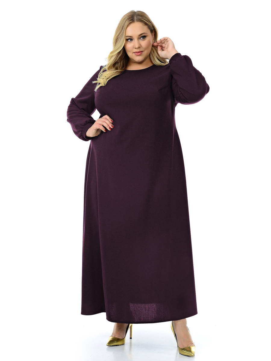 Длинное платье А-силуэта из крепа с эластаном. Вырез горловины округлый. По центру горловины спинки вырез "капля", застегивающийся на хрустальную пуговицу. Рукав длинный, по низу легкая сборка, на манжете.