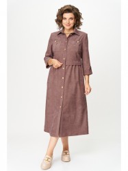 Платье женское полуприлегающего силуэта с втачным рукавом. Застежка на пуговицы на притачных планках. По горловине отложной воротник на отрезной стойке. Верх платья с завышенной талией. По переду накладные карманы. Низ платья – длинная свободная юбка со сборкой из-под верхней части платья и карманами в боковых швах. Рукав длиной 3/4 с отложной манжетой и патой на пуговице.