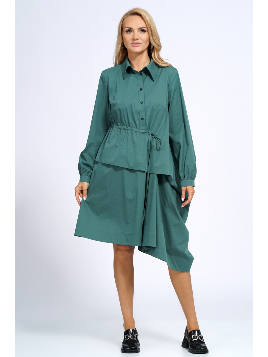 Платье женское А-образного силуэта, с застёжкой смещенной влево по притачной планке на петли, пуговицы, по линии талии правой стороны кулиса с завязкой и фиксаторами фиксируемая степень прилегания и баска переходящая в мягкую драпировку по левому боковому, с разноуровневым низом. Перед с нагрудными выточками. Спинка со средним швом и отлетной кокеткой верху по левой части. Рукава втачные, одношовные, длинные понизу с разрезом, сборкой и притачными манжетами на петлю и пуговицу. Воротник стояче-отложной на отрезной стойке застёгивающаяся на петлю и пуговицу.