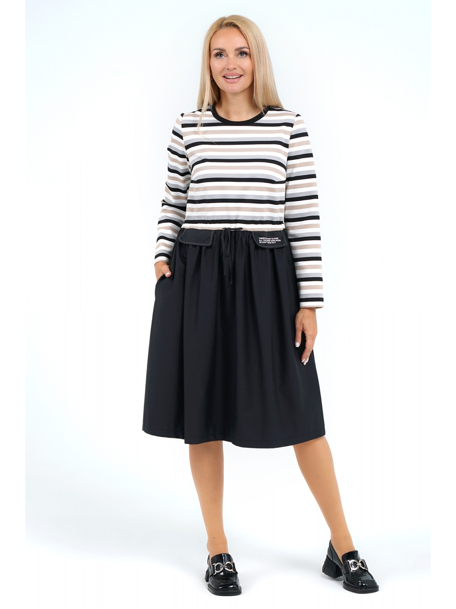 Оформить заказ →Платье прямого силуэта верху, отрезное по линии талии с кулисой фиксируемая степень прилегания с окантовочным шнуром, нижняя часть со сборкой по линии соединения в шве по переду и спинке паты. Перед с нагрудными выточками. Рукава втачные, одношовные, длинные. По горловине втачная бейка. Декорировано по левой пате переда термоаппликацией.