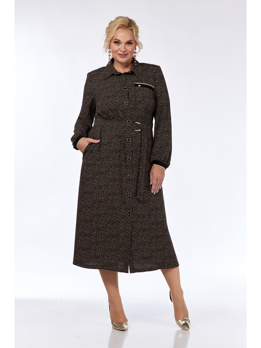 Платье женское А-силуэта, выполнено из неплотной плательной ткани. Воротник стояче - отложной с отрезной стойкой. Застежка центральная с притачной планкой на петли и пуговицы. По переду нагрудный накладной карман, с отделочной планкой из довяза. Спинка со средним швом. Рукава втачные, одношовные, длинные по низу присобраны на декоративный довяз. В боковых швах обработаны карманы. Имеется пояс из основной ткани с декоративной пряжкой.