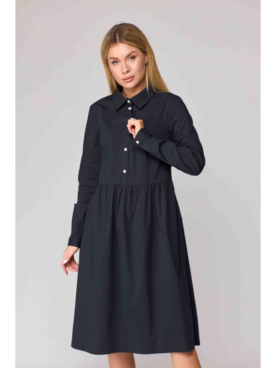Стильное, современное, удобное и уютное платье выполнено из хлопковой ткани, полуприлегающего силуэта.Платье с отрезной линией талии. Рукав втачной, полной длинны, на притачной манжете с застежкой на петлю и пуговицу. Горловина округлой формы с воротником стоечкой. Передняя часть платья дизайнерски оформлена планкой - застежкой с пуговицами. Платье без подкладки.