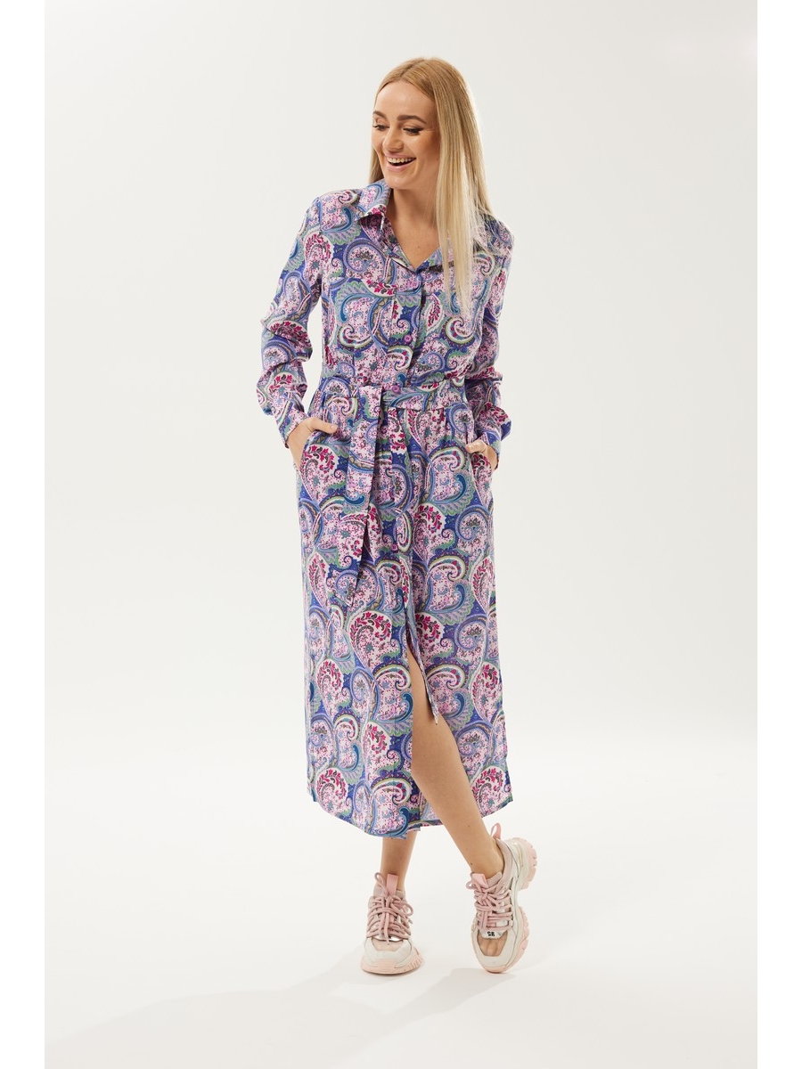 Длинное платье рубашечного типа с ярким запоминающимся принтом. Застежка центральная на петли и пуговицы. Горловина с отложным рубашечным воротником на стойке. Рукав длинный одношовный втачной, низ рукава оформлен манжетой на две петли и пуговицы. Нижняя часть платья фгурная, в боковых швах разрезы. В комплект идет пояс из основной ткани.