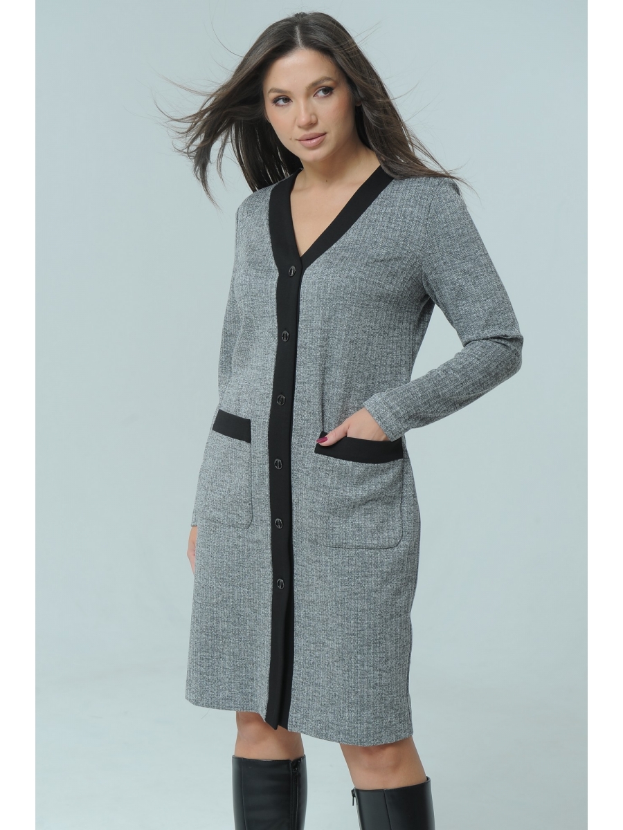 Горловина с V-образным вырезом, застежка центральная на петли и пуговицы. Полочка с накладными карманами. Спинка цельная с талиевыми вытачками. Рукав одношовный втачной, длинный.