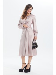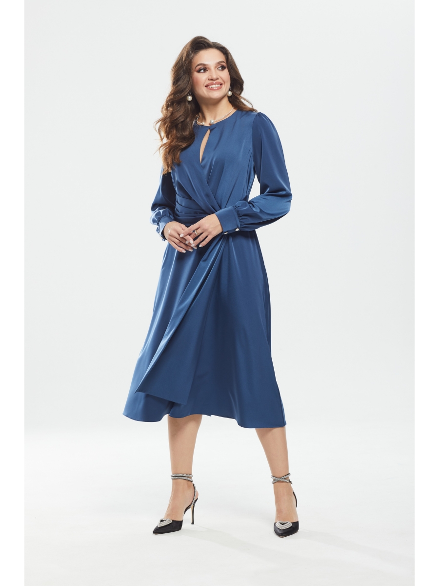 Приталенное платье из текстильной ткани. Отрезное по линии талии с юбкой, расширенной к низу. Спинка со средним швом и застежкой молнией. Перед ассиметричная полочка с декоративным вырезом и декоративным элементом в виде пояса. Рукав втачной длинный на манжете.