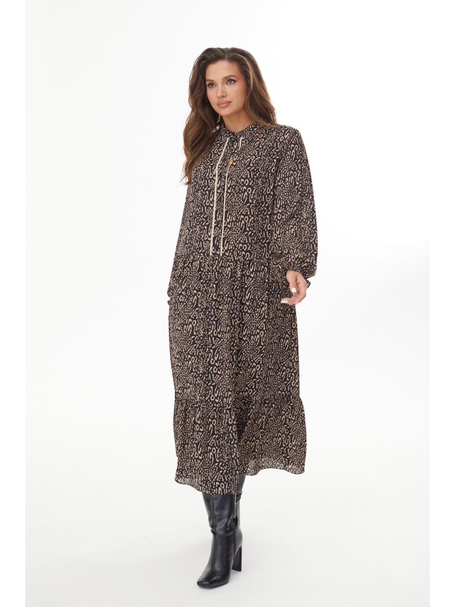 Оформить заказ →Платье из струящейся ткани свободного силуэта отрезное ниже линии талии. Горловина обработана воротником-стойкой. По переду планка с кружевной отделкой по обеим сторонам. Юбка платья - два волана со сборкой. Рукав втачной длинный, расширенный книзу, собран на резинке. По низу рукава рюша. Без подкладки.