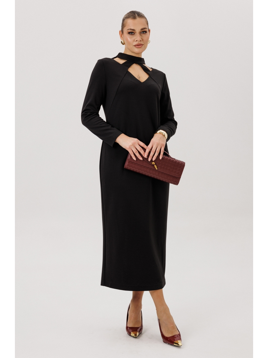 Таинственность великолепного чёрного платья не останется не замеченной. Она элегантно и лаконично, однако оригинальное исполнение выреза горловины со сложным геометрическим решением, делает образ очень эффектным. Полуприлегающий силуэт, втачной покрой. Полочка с рельефом, переходящим в вырез горловины. Спинка с центральным швом, разрезом и молнией, цельнокроеной стойкой и талиевой вытачкой.