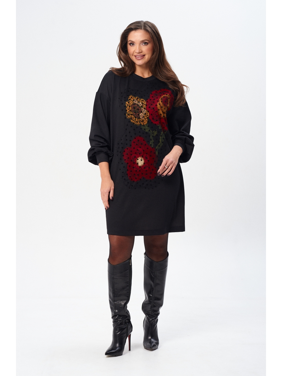 Платье (туника) свободного силуэта из трикотажной ткани с принтом. Рукав втачной одношовный со складками по низу и манжетой. Горловина обработана планкой. По переду поверх принта настрочена сетка. Сетка может быть заменена с сохранением художественного образа изделия.