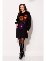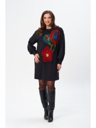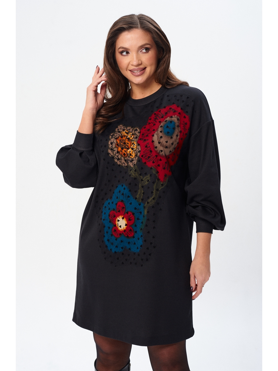 Платье (туника) свободного силуэта из трикотажной ткани с принтом. Рукав втачной одношовный со складками по низу и манжетой. Горловина обработана планкой. По переду поверх принта настрочена сетка. Сетка может быть заменена с сохранением художественного образа изделия.