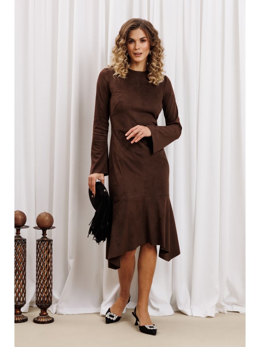 Платье приталенного силуэта отрезное по линии талии из мягкой замшевой ткани. Перед со средним швом и нагрудной вытачкой. Спинка с талиевыми вытачками, средним швом и потайной молнией. Рукав втачной слегка расширенный книзу. По низу изделия ассиметричный волан. Средний шов и шов вдоль талии отстрочен отделочной нитью.