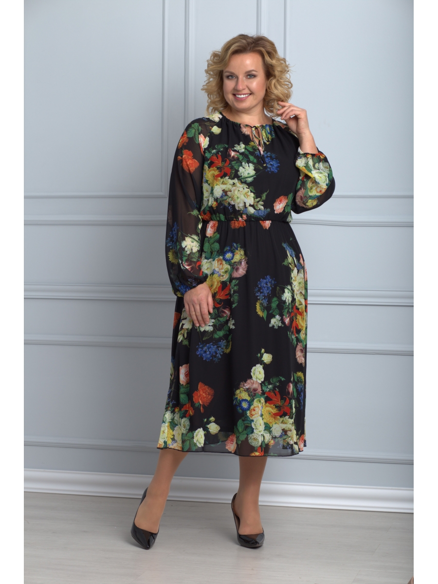 Платье отрезное по линии талии, юбка расклешенная, вырез горловины скругленный. Рукав реглан.