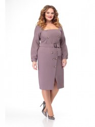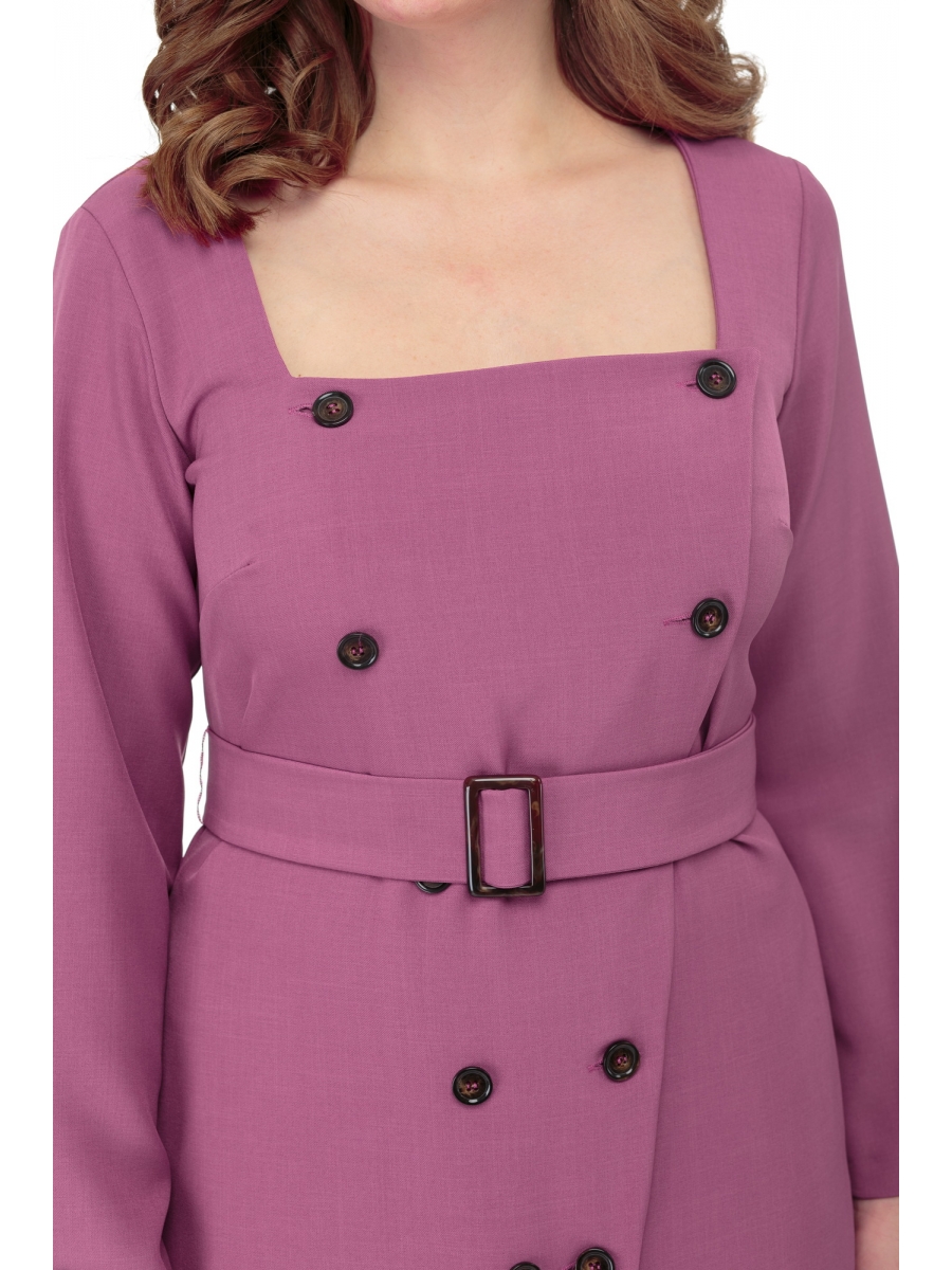 На спинке талиевые вытачки. Актуальная форма выреза и линии борта подчеркнута фурнитурой натурального оттенка. Рукава втачные, длинные, с отделкой пуговицами. Съемный пояс с пряжкой дополняет образ.
