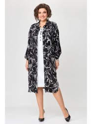 Платье-рубашка это тот предмет гардероба, который любят женщины во всем мире. Стилизация с платьем-рубашкой придает много женственности и красоты любой фигуре. Платье состоит из удлинённой рубашки с отложным воротником. По передней части планка, застежка пуговицы. Свободный крой, по бокам фигурные подрезы. Вторая деталь этого наряда имитация платья. То есть передняя часть платья однотонного черного цвета вшита по боковым швам в саму рубашку и создается впечатление, что наряд двухпредметный. В растегнутом виде смотрится как платье и поверх надета рубашка. Однотонная часть платья выполнена из мягкой и приятной ткани CREP VELVET SIYAN. Ткань цветная BRUNO на вид как плотный атлас. Обе ткани хорошо ложатся и выглядят богато.