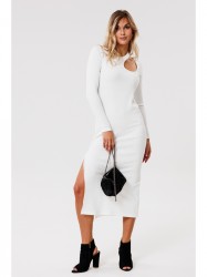 Платье женское прилегающего силуэта из трикотажной ткани. В боковом шве расположен разрез. Горловина оформлена декоративным вырезом. Рукав прямой одношовный.