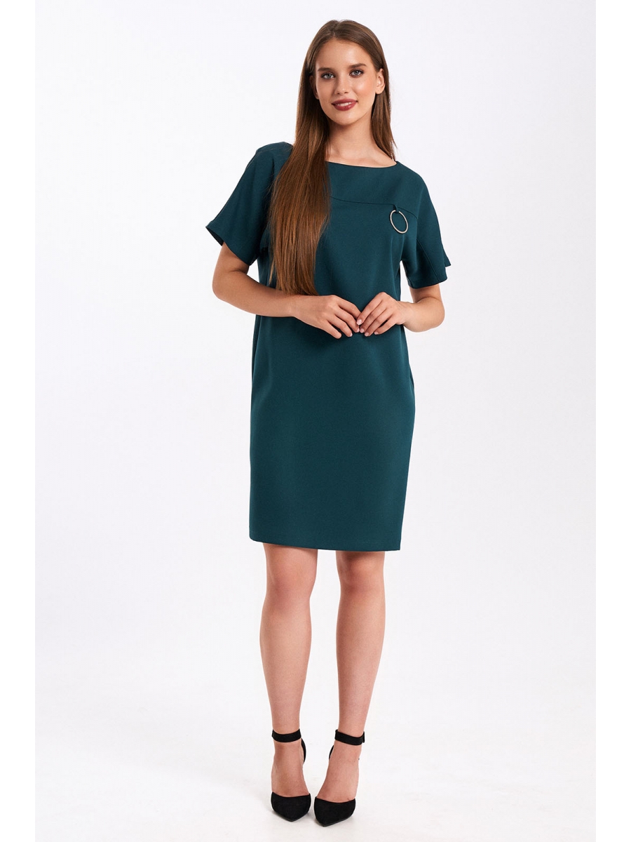 Платье женское свободного кроя, прямого силуэта с цельнокроеным рукавом. Горловина – лодочка.На левой стороне переда декоративное металлическое кольцо. Спинка с фигурным вырезом, украшена металлическими кольцами.
