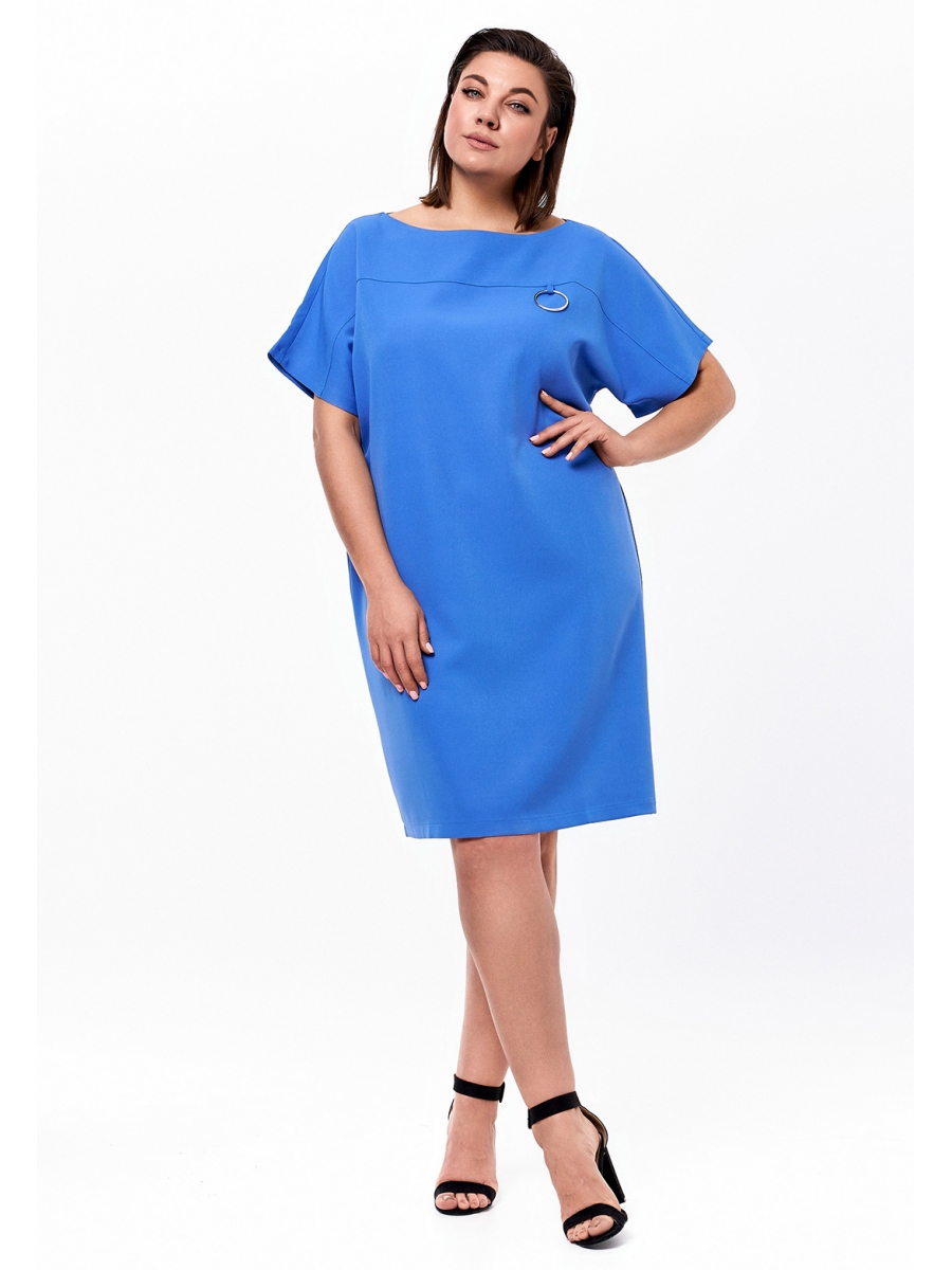 Платье женское свободного кроя, прямого силуэта с цельнокроеным рукавом. Горловина – лодочка.На левой стороне переда декоративное металлическое кольцо. Спинка с фигурным вырезом, украшена металлическими кольцами.