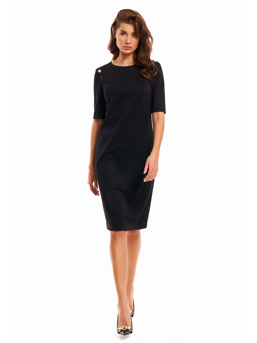 Платье женское из плотного трикотажного полотна, полуприлегающего силуэта, с втачными рукавами и овальной горловиной. Платье с застежкой от горловины на потайную тесьму-молнию в среднем шве спинки. Средний шов спинки заканчивается шлицей. Платье с имитацией пристёгивающихся рукавов в области верхней части оката на металлические пуговицы. Рукава втачные одношовные, длиной до локтя.