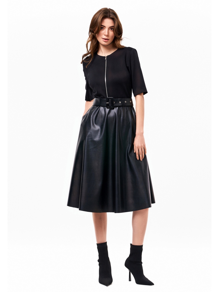 Приталенное платье с расклешённой юбкой выполнено из трикотажного полотна в сочетании с экокожей. По переду от горловины до пояса декоративная металлическая молния.