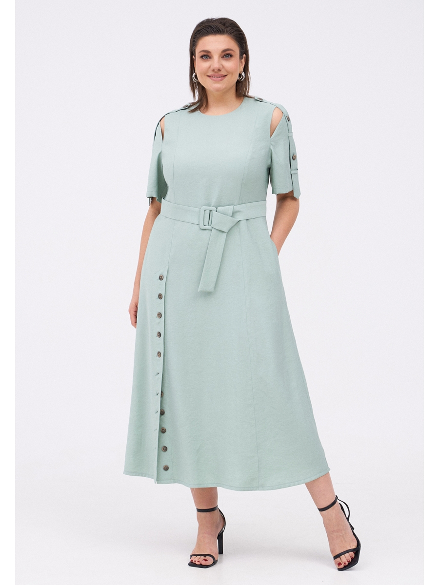 Силуэтное платье с разрезами на плечах и декоративными патами на рукавах. По переду два рельефа, проходящих через центр груди. По низу рельефа справа шлица с регулируемой длиной разреза за счёт застёжки на пуговицы. Платье застёгивается на потайную молнию на спинке.