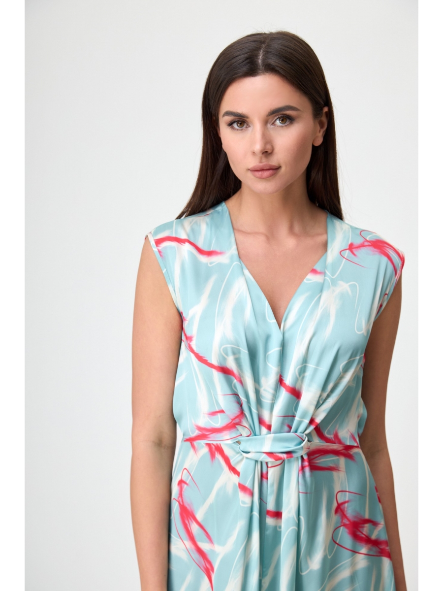 Платье женское прямого силуэта, чуть расширенное к низу, длина миди. По переду V-образный вырез горловины, по линии талии декоративный узел подчеркивающий вашу грудь. Для удобства передвижения разрез в среднем шве по переду. Линия талии спинки на резинке. Дизайнерский принт, актуальная расцветка, лёгкость, женственной и комфорт. Вся необходимая информация о производителе указана на этикетке.