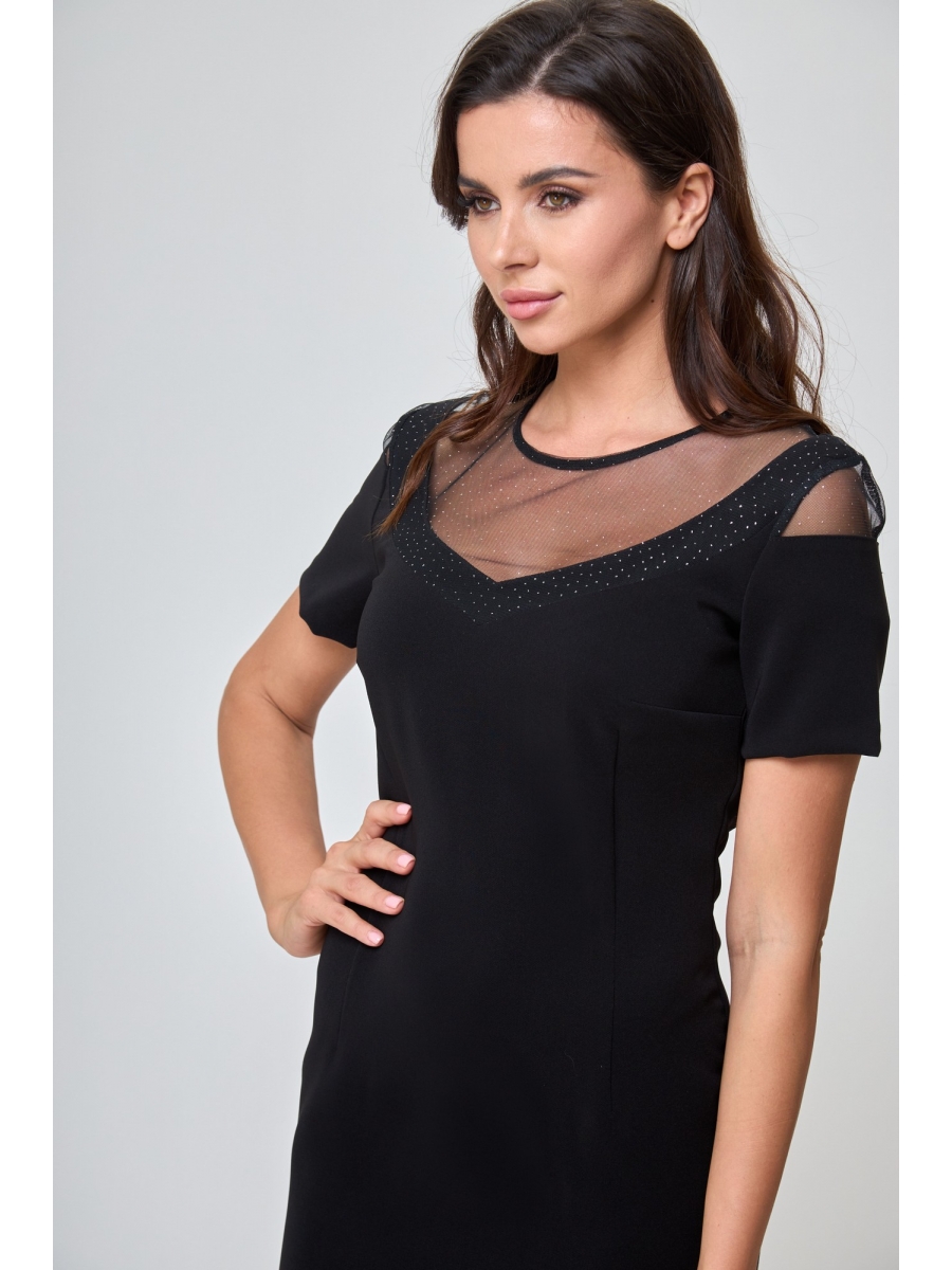 Платье женское прилегающего силуэта, длиной до колена. Рукав короткий, с декоративной деталью по окату. Кокетка переда фигурно оформлена и декорированна мерцающей сеткой. Кокетка спинки углублена и оформлена таким же материалом, в среднем шве молния. Горловина округлая обработана окантовкой. Как говорила Коко Шанель: « У каждой женщины должно быть маленькое чёрное платье». А в данной модели вы будете выглядеть утонченно, элегантно и женственно.