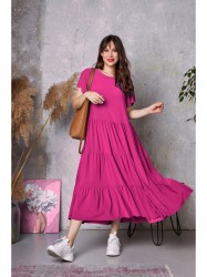Платье женское трапециевидного силуэта из трикотажного полотна "масло"- идеальный вариант для повседневного образа. Будет отлично смотреться с босоножками, кроссовками или балетками. Отрезное по линии талии, с 3-мя воланами. Рукав короткий, расширенный к низу. Легкую непринужденность модели придают необработанные низ платья и рукава. Благодаря своему крою сядет на любую фигуру и скроет все недостатки.